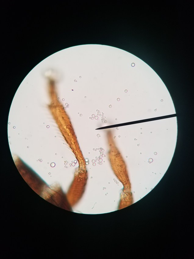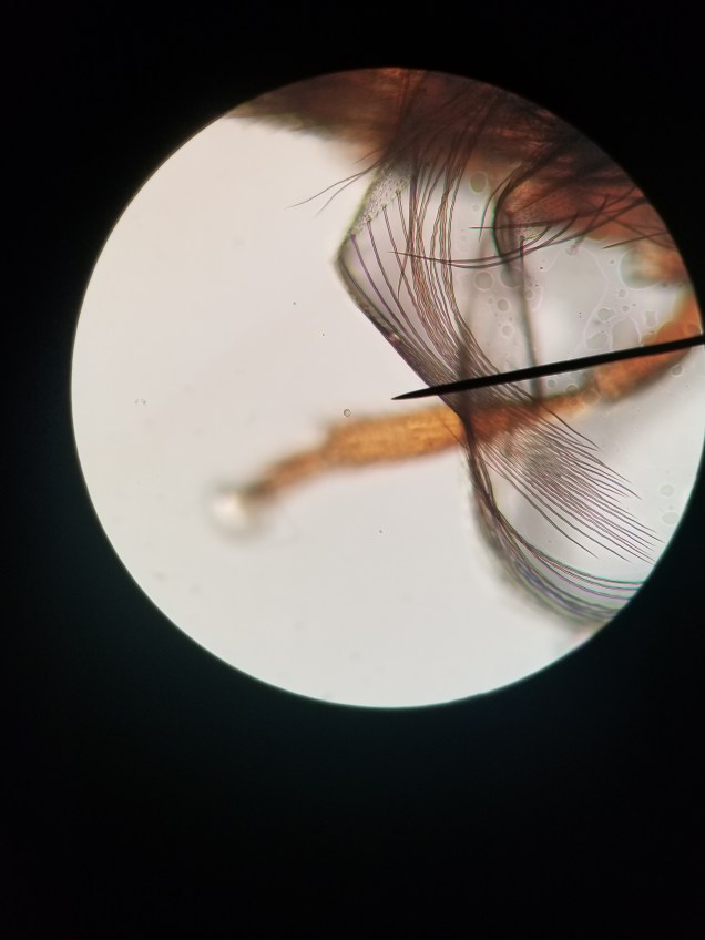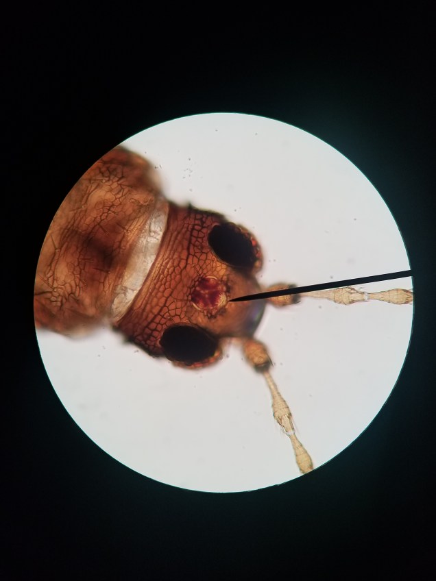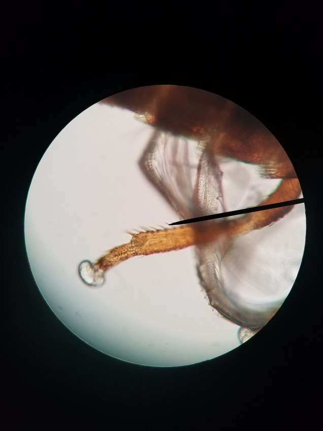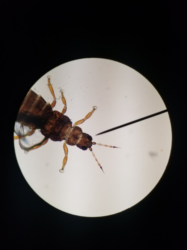 This thrip below I found on my zebra Haworthia succulent and caught on a piece of tape. It got stuck in a pipette for almost 30 minutes while I was trying to get it on the slide without wrecking it. It doesn’t look like much zoomed out, and it would have helped if I had noticed my camera wasn’t focused.
