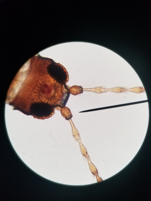 An adult thrip under a microscope, you can see the whole body of the insect.