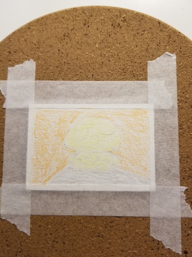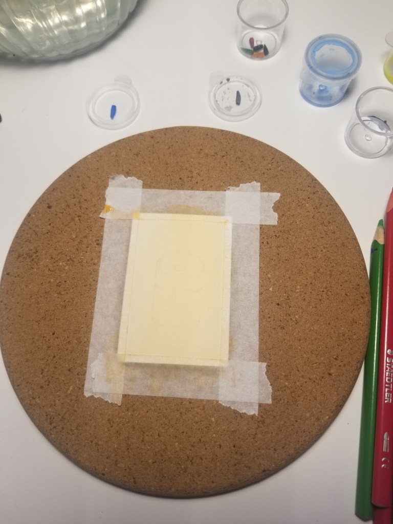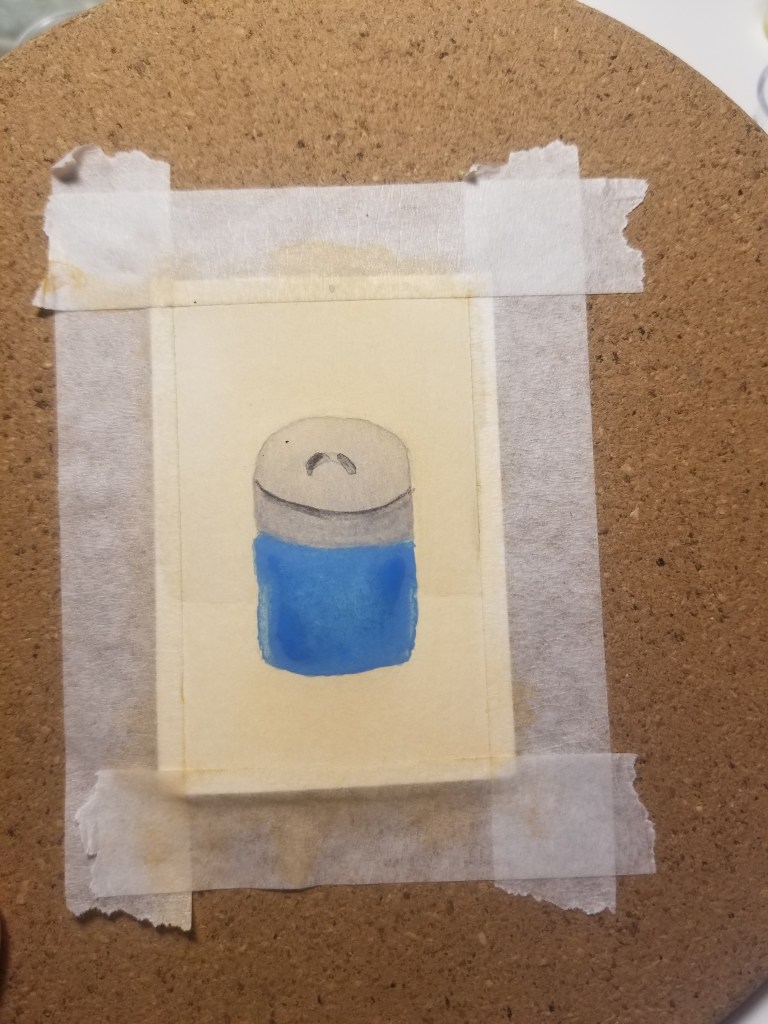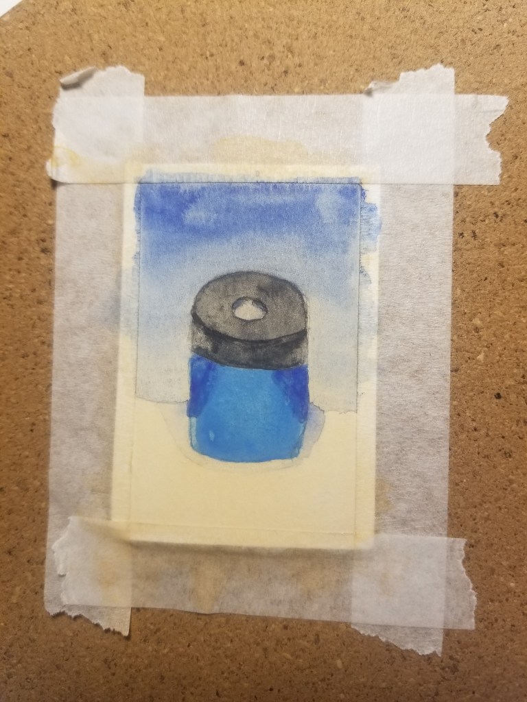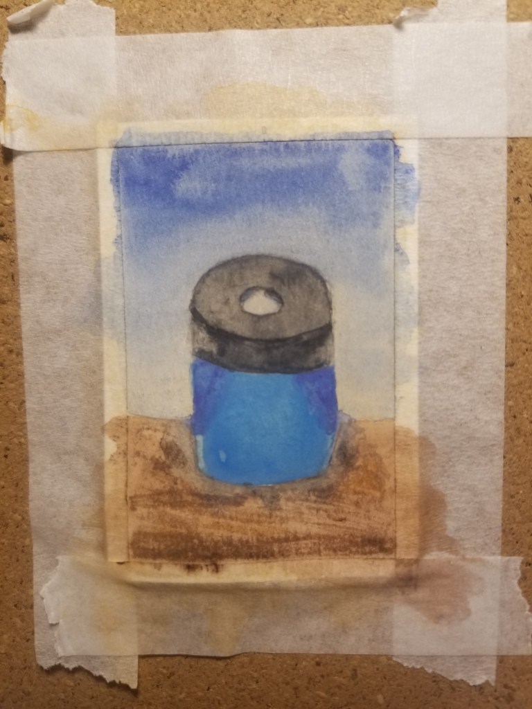 16. A pencil sharpener. I had the notion to try an underpainting of orange just to see what would happen. It gave me the shade of blue I wanted, but I regret putting it on the entire thing. I also overworked it a bit and wished I had left the table just white.