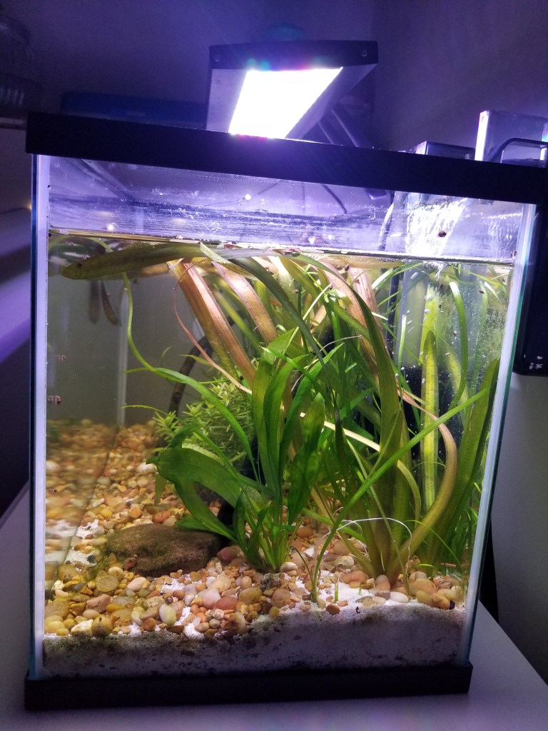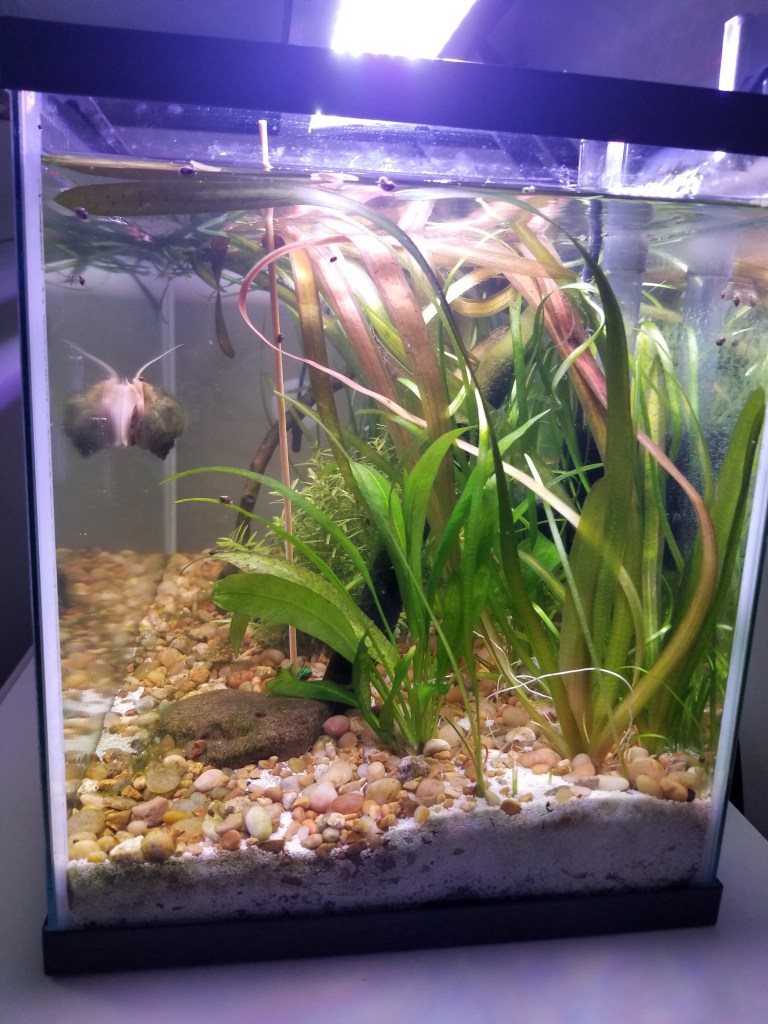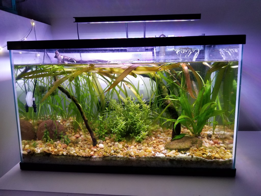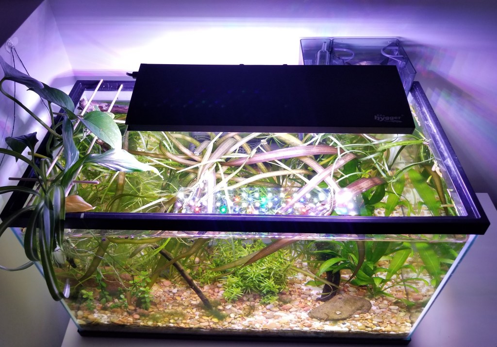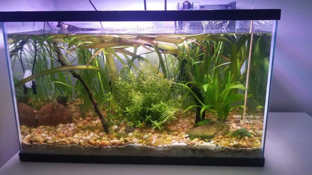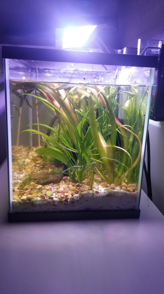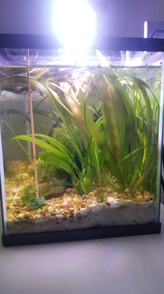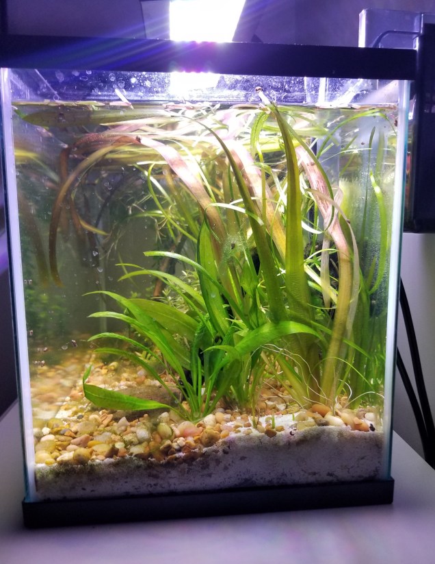 I’ve done a lot of research and I think I’m going to get some red cherry shrimp. Shrimp were the original special interest that led to this aquarium. I also think I’m going to look for a lid, because topping up the evaporated water all the time is starting to get old. My goal is to have as low maintenance an aquarium as possible.