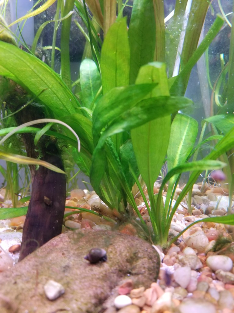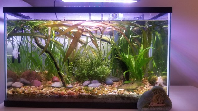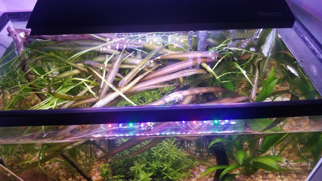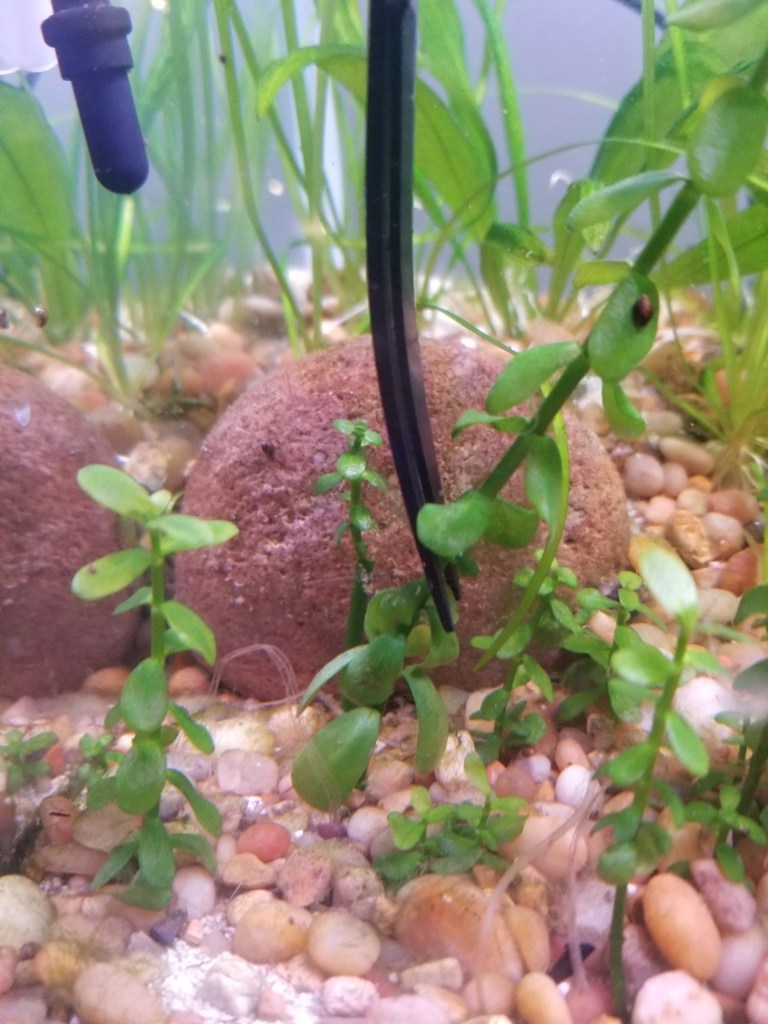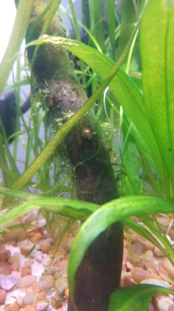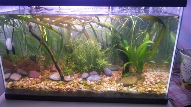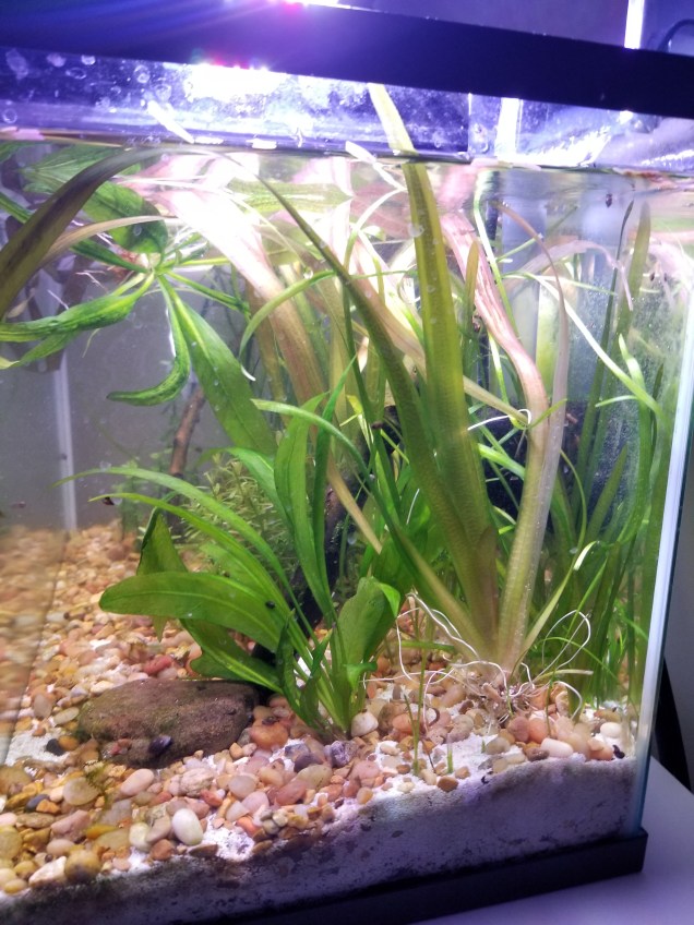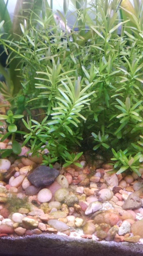 I gave some plants a little trim, to keep them from blocking the light from the neighbouring plants that I want to grow. I had a bag of river rocks, so I’m now experimenting with using them to keep the plants contained. Though I know it’s going to take me awhile to get the knack of hardscaping. I also pulled out some algae and more Vallisneria that was putting pups where I didn’t want them yet. I also added some more liquid fertilizer and added more water.