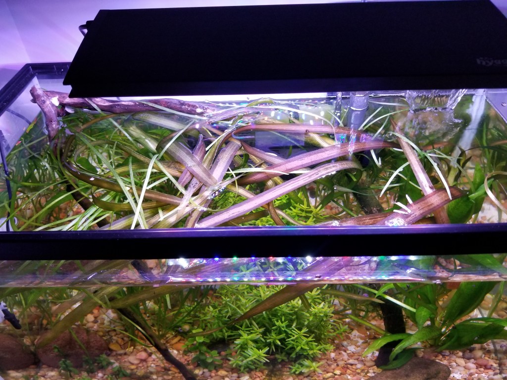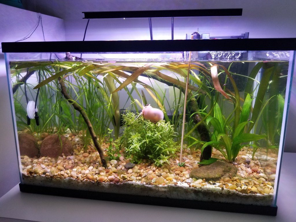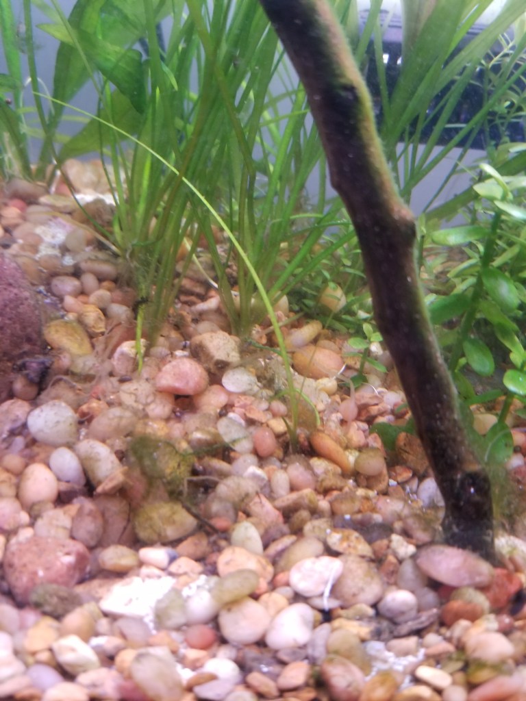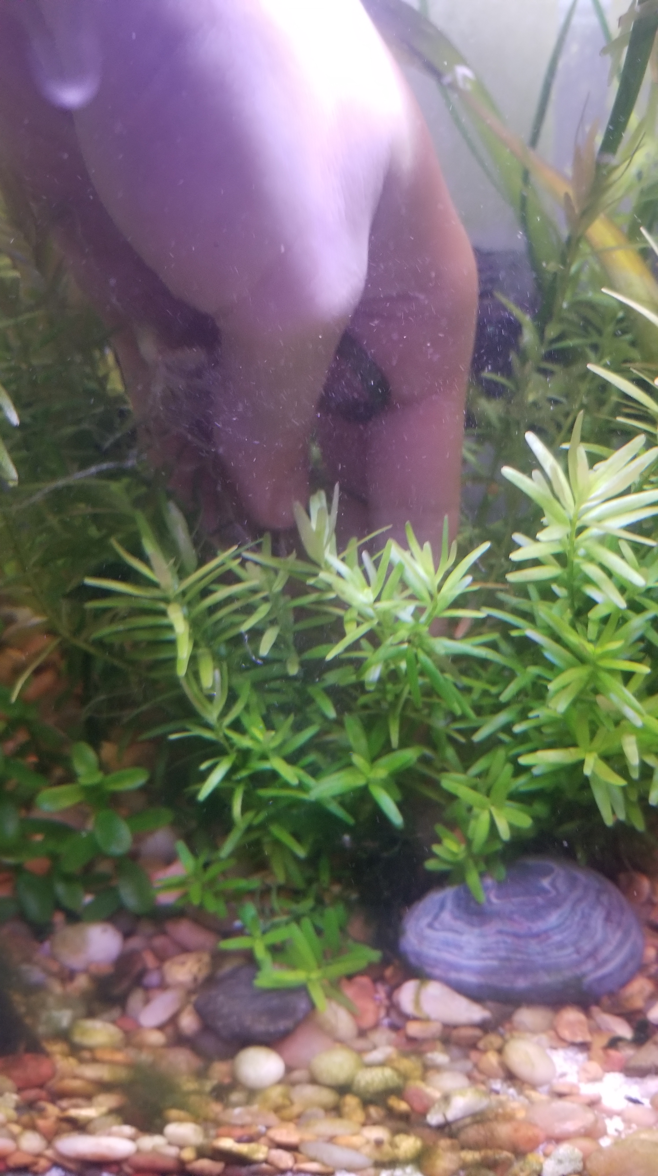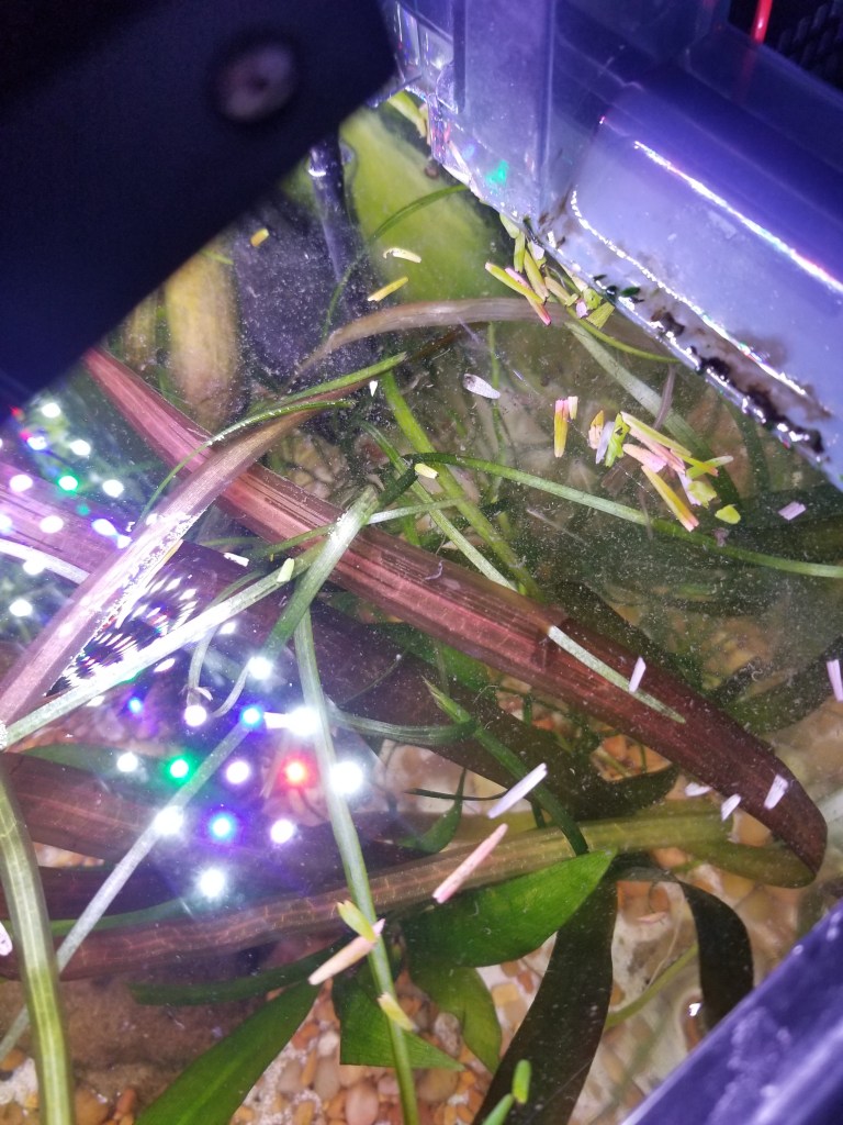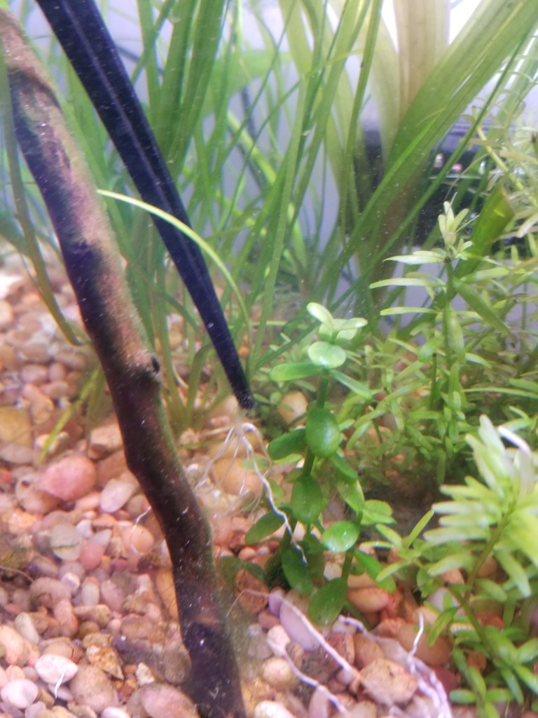 I gave some plants a little trim, to keep them from blocking the light from the neighbouring plants that I want to grow. I had a bag of river rocks, so I’m now experimenting with using them to keep the plants contained. Though I know it’s going to take me awhile to get the knack of hardscaping. I also pulled out some algae and more Vallisneria that was putting pups where I didn’t want them yet. I also added some more liquid fertilizer and added more water.