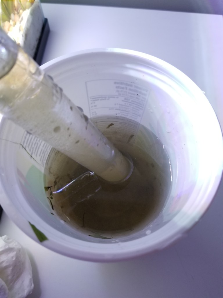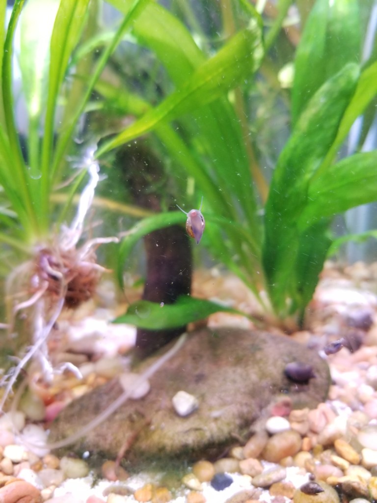 I rinsed my pre-filter sponge again, topped up the water, and added liquid fertilizer. Here’s the next day (the skewer is holding some spinach for the snails).