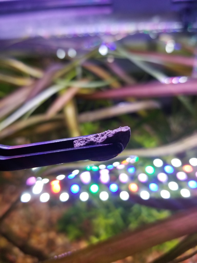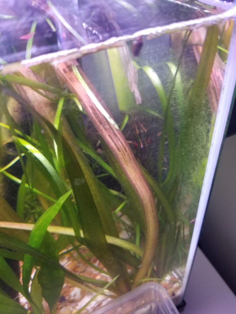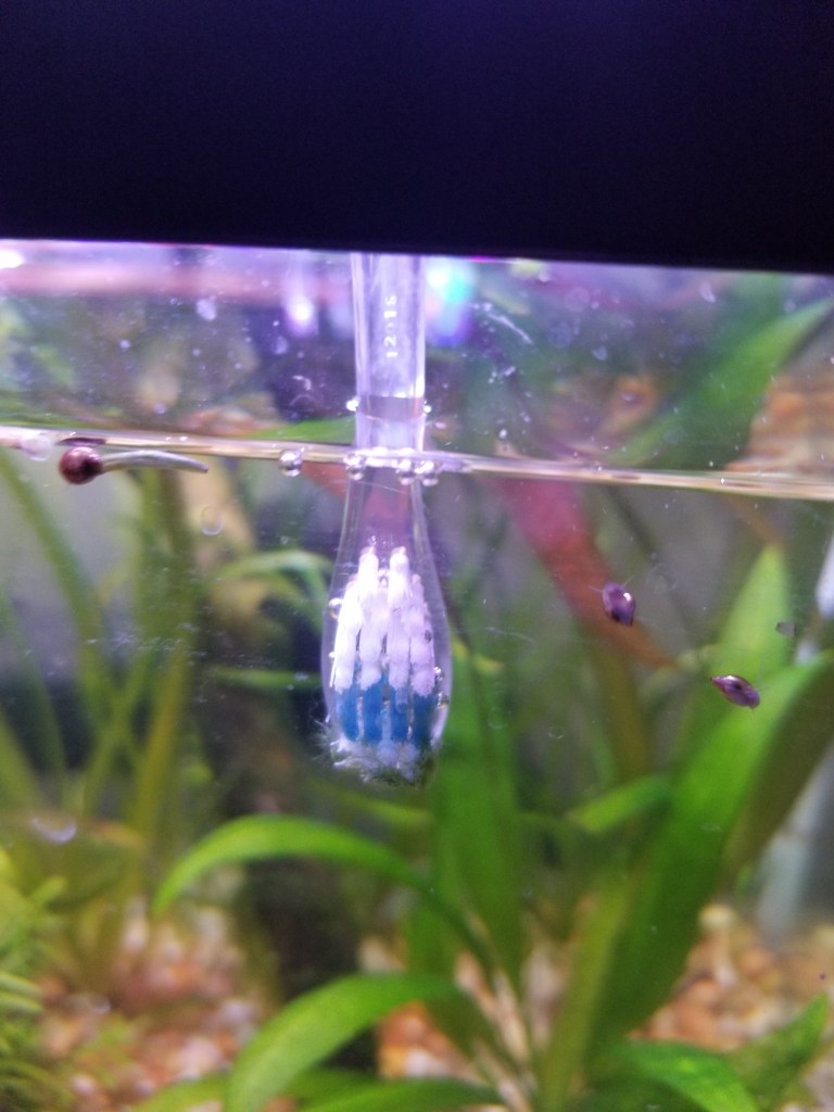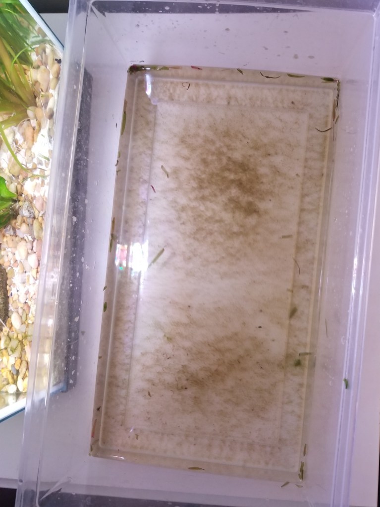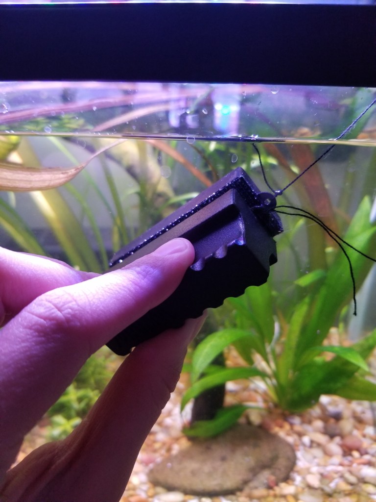 I took another break and now I can do some detailing. I used a toothbrush to scrub off the hard water build-up, picked up floating plant bits, and cleaned the inside glass with a magnetic algae scrubber.