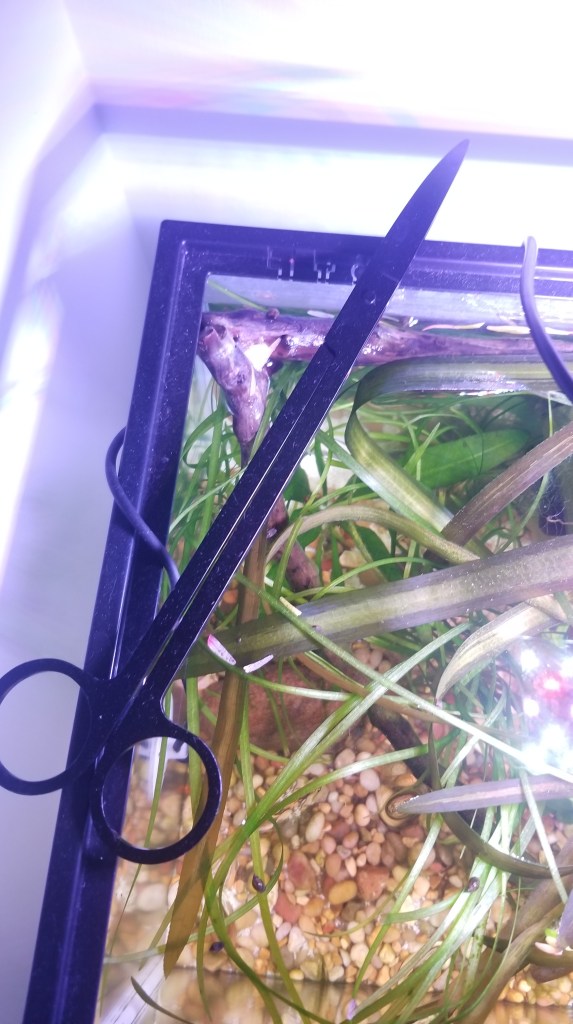 I got set-up with my towels and tools, then I couldn’t find my plant trimmers anywhere! It was infuriating! I looked all over the room and even wondered if someone had borrowed them. I knew they were there earlier. Yes they were, I left them on top of the aquarium… to remind me to do maintenance (boy did that word need a spell checker!). But they’re black; black objects live in the void and no longer exist in this realm.