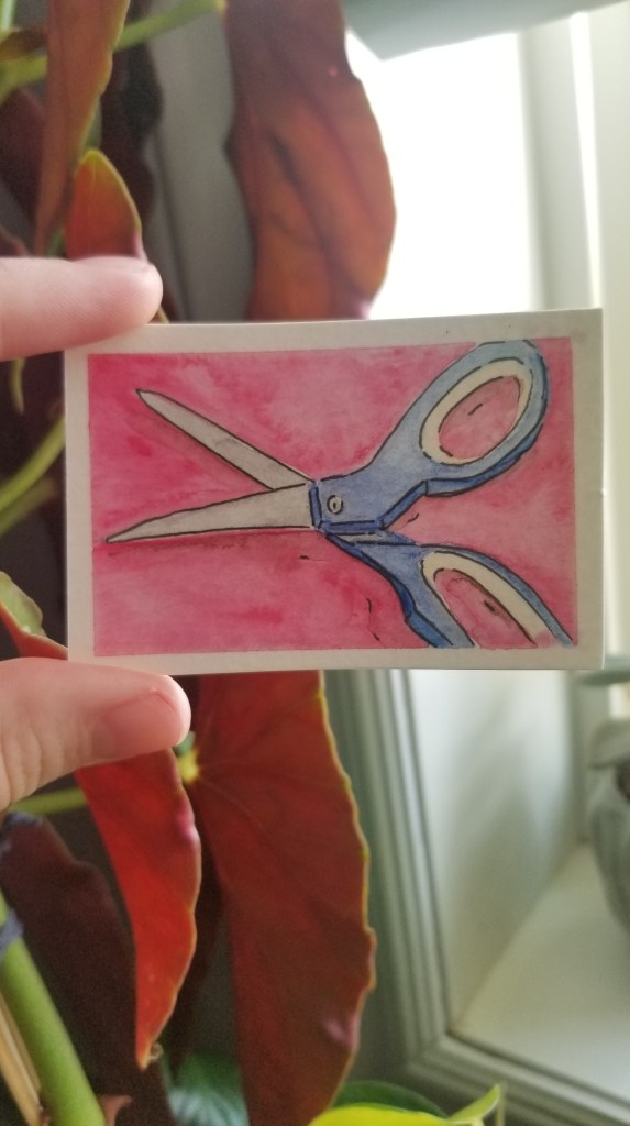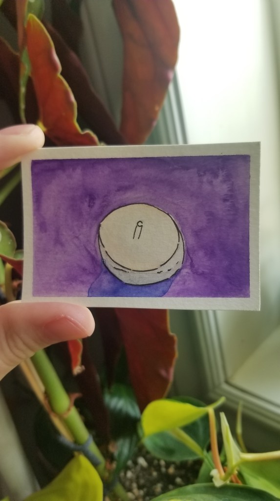 Here we are again with 5 more paintings! The idea is to simply practice, not try for perfection (OCD I’m looking at you!). Like most of my other paintings, these are just small objects from around my room. I’m using Staedtler watercolour pencils and a fine tip Sharpie.