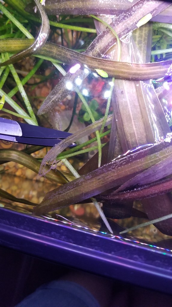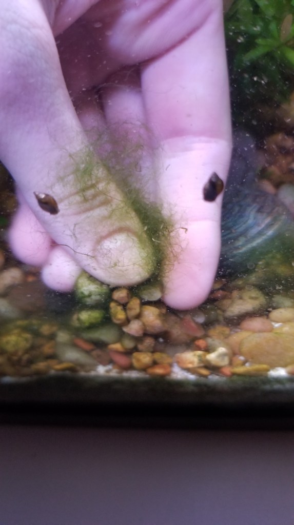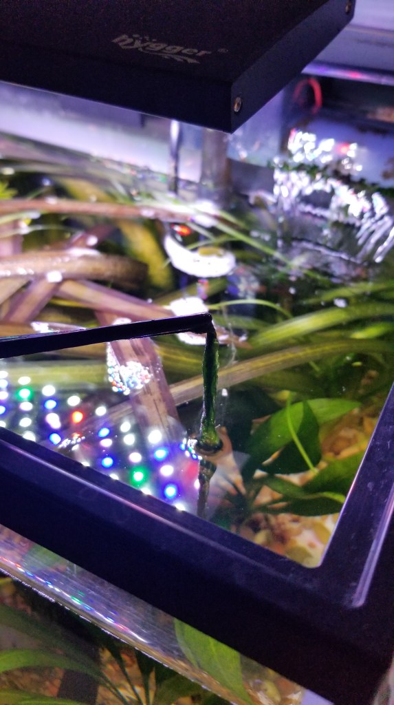 I’m removing some algae this week. I used to have trouble with hair algae, but this is a new one. It’s slower growing and feels very sticky. Unlike hair algae, it attaches to surfaces very well. I found the easiest way to get it off is to use my fingers and rub it into a ball.