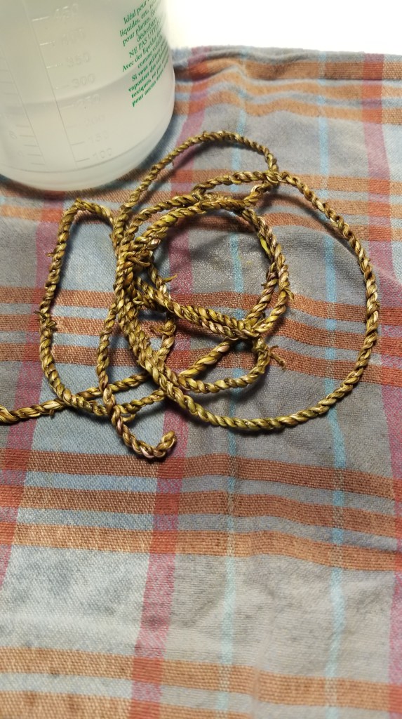 I have this cordage I made last week. I’m wetting it with a spray bottle and damp towel to make it less brittle.