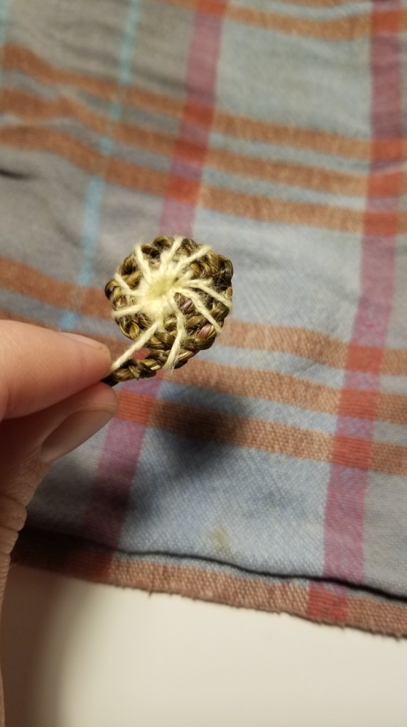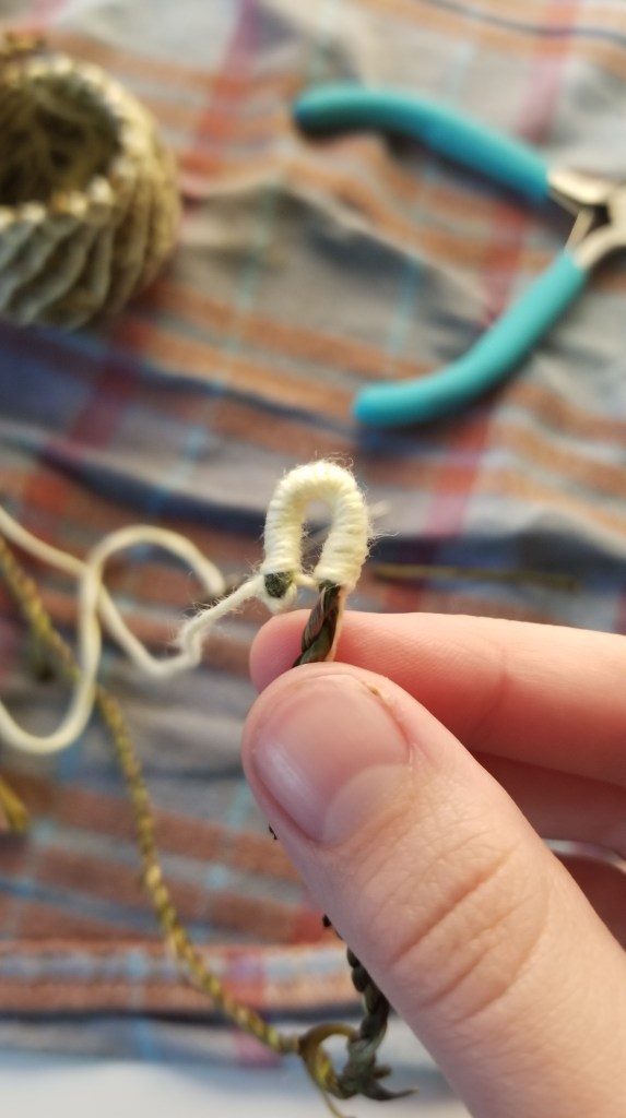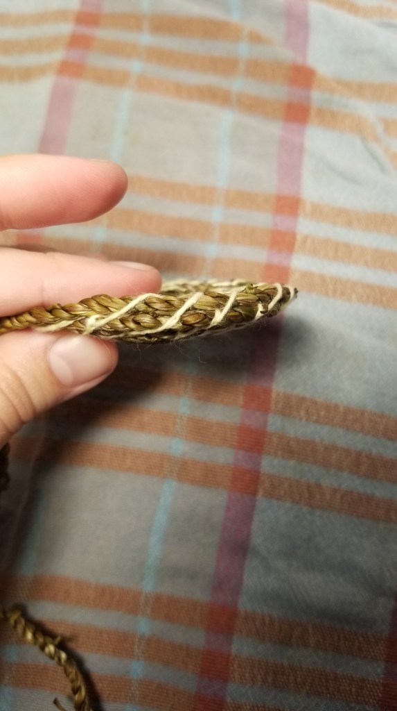 Once I’ve got enough, I start to coil it. I pierce through it with a needle (using pliers as needed) to start a base. Then start stitching around it.